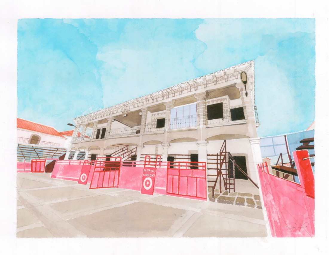 Ce tableau montre le bâtiment faisant face à l’église et faisant office de toril avec l’aménagement temporaire de sa tribune, pour constituer une arène pour les fêtes du village chaque été, donnant lieu à la tenue de corrida, de vachettes, de concours des jeux de la rana (jeu de la barrique), de pétanque et de calva (morillo). |