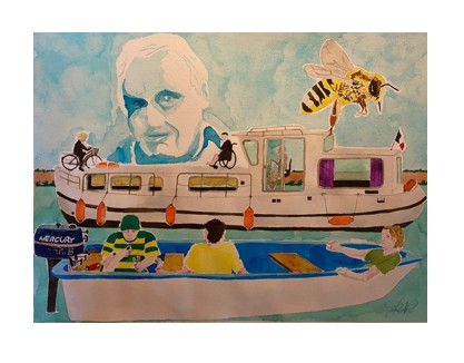 Un cousin captivant, ce tableau fait référence à l’une de mes nombreuses anecdotes partagées avec ce dernier. Et quelles anecdotes ! Pour celle-ci, imaginez, je suis avec mon cousin et son fils, nous sommes parti faire un tour de bateau et soudain le moteur a des ratés et s’arrête finalement. Mon cousin s’affaire à le redémarrer et là une pénichette vient à passer et sur son pont, une personne en fauteuil roulant nous posa cette question : « Vous êtes en panne de voiture ? ». mon cousin sans savoir qui était l’auteur de ce propos s’exclama d’instinct : « Et en plus on se fout de ma gueule ! ».