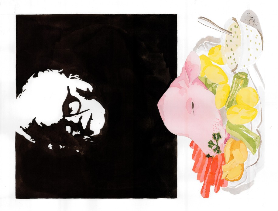Ce tableau est un hommage à l’une de mes tantes. Il illustre une anecdote personnelle, que j’ai partagé avec elle, lors d’un déjeuner autour d’une tête de veau, sa première à … 94 ans.