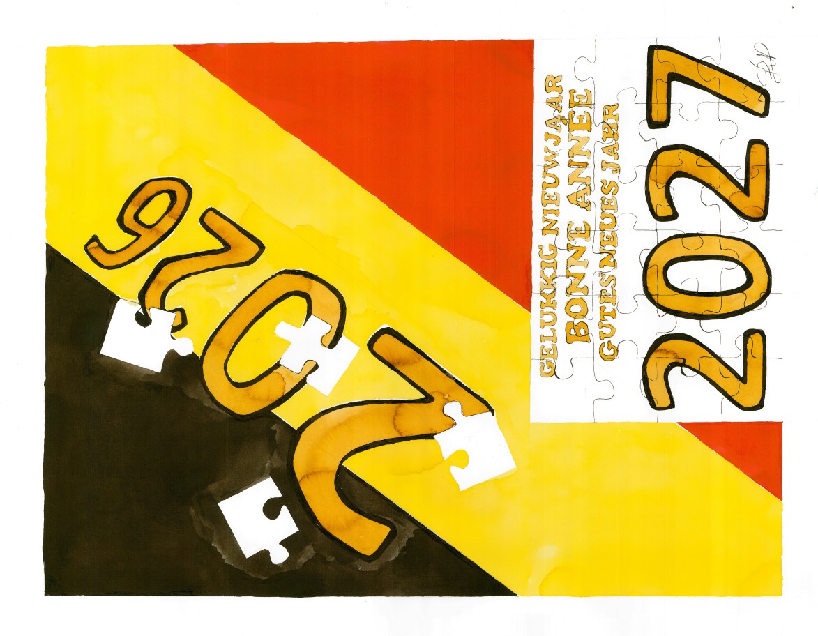 Deze afbeelding is een illustratie voor een nieuwjaarskaart voor 2027 in de kleuren van de Belgische vlag. Het puzzelmotief is symbolisch: het drukt de wens uit om verdeeldheid (de afzonderlijke puzzelstukjes) op te heffen en eenheid (de complete puzzel) te bereiken in 2027.