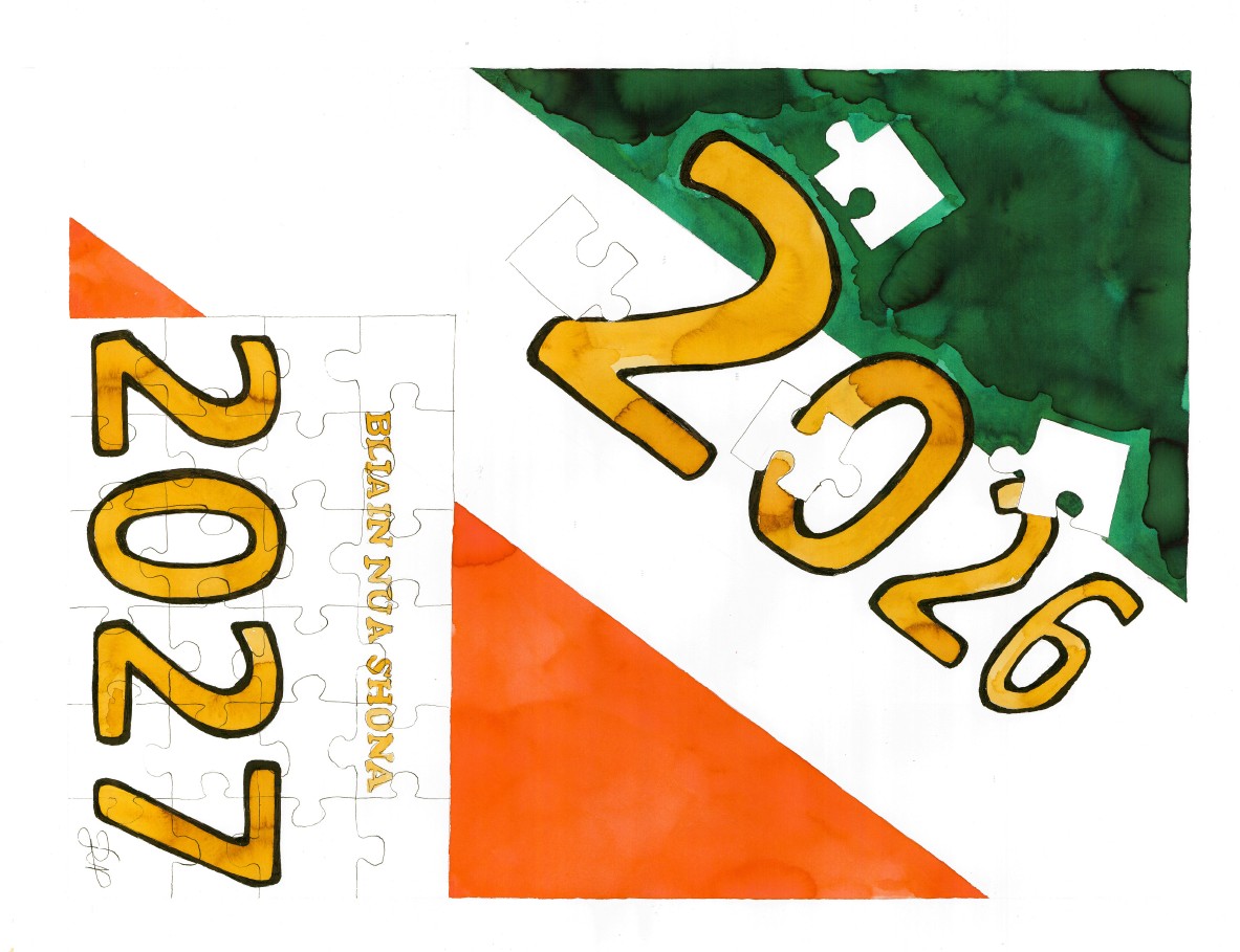 This image is an illustration for a New Year's greeting card for 2027, incorporating the colors of the Irish flag. The puzzle motif is symbolic: it expresses the desire to eliminate divisions (the individual pieces of the puzzle) and achieve unity (the complete puzzle) in 2027.