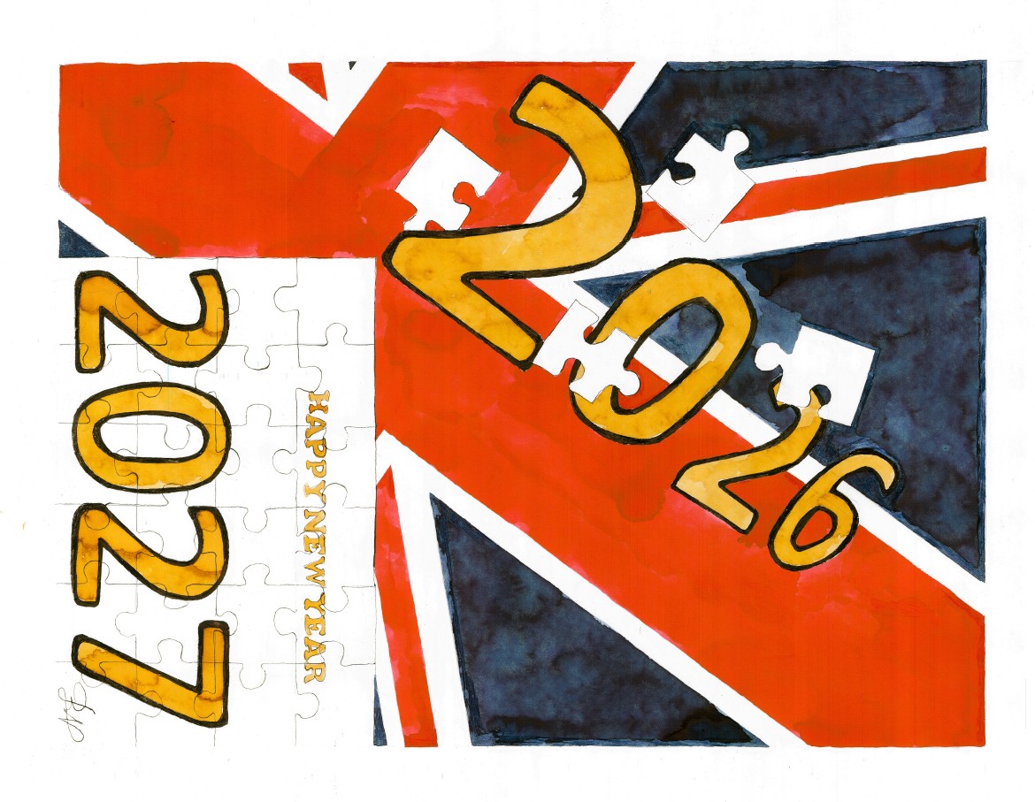 This image is an illustration for a New Year's greeting card for 2027, incorporating the colors of the Union Jack. The puzzle motif is symbolic: it expresses the desire to eliminate divisions (the individual pieces of the puzzle) and achieve unity (the complete puzzle) in 2027.